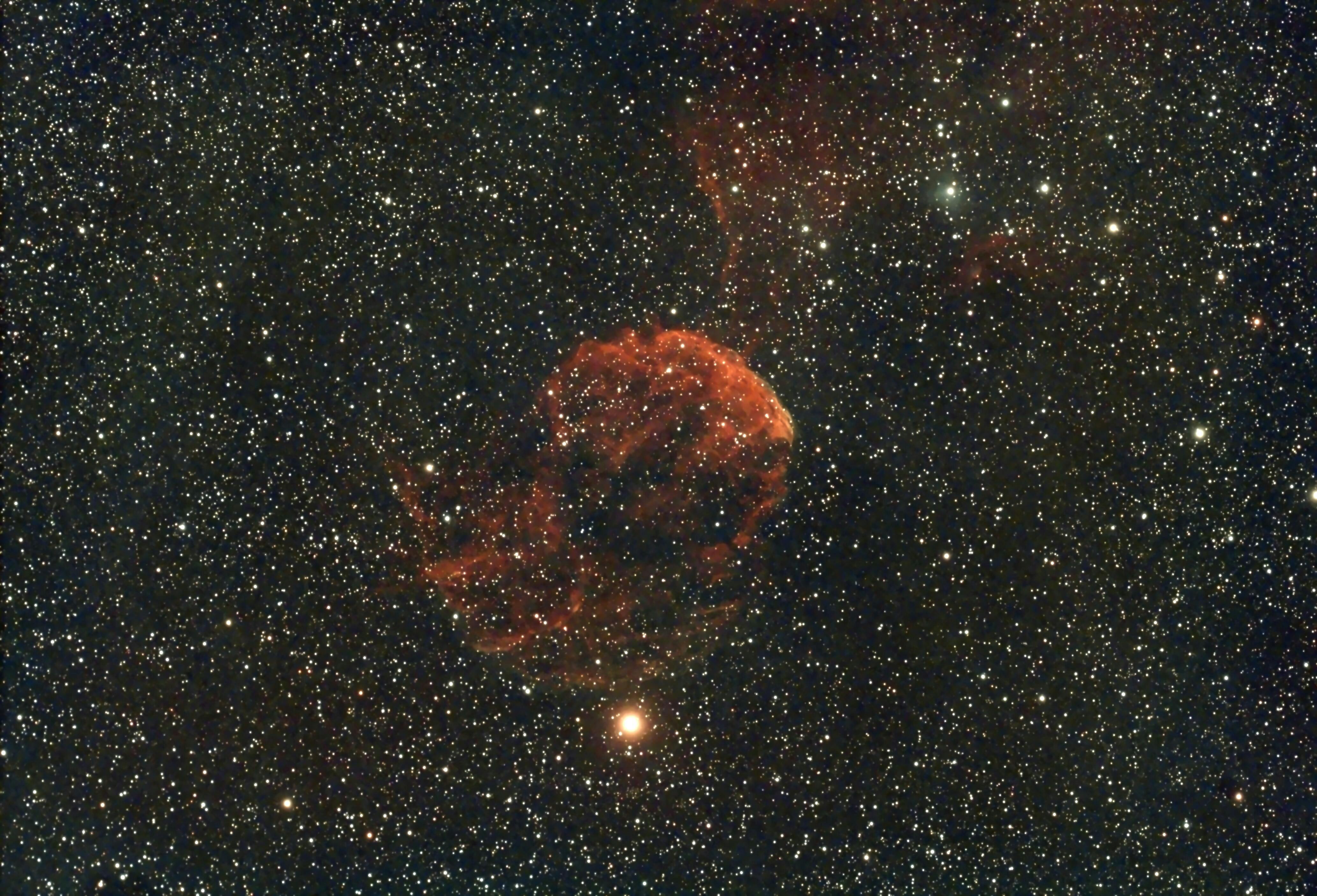 星像は素晴らしく、フォーサーズの冷却CMOSカメラの4隅でも収差は感じられず、メーカーのスポット図の通り、偽りがない性能を発揮しています。一つ注文をつけるとすれば、収差が少ない分、ピントがシビアで、ピント合わせの回転リングをほんのちょっと回しただけでも、また、温度変化によってもピントのずれが出てしまうので、その点を理解したうえで運用する必要があります。年末・年始の休みの期間中にいろいろな散光星雲を撮影しましたが、満足のいく写りになっています。